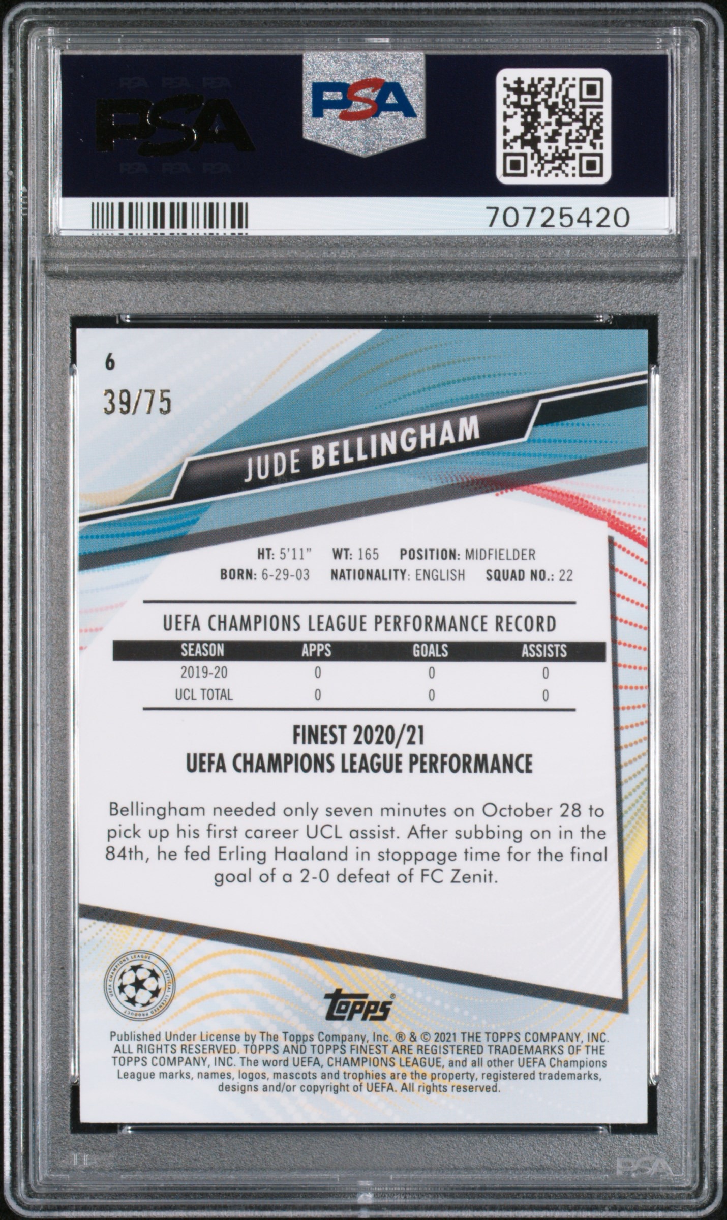 Be the first to review “2020 TOPPS FINEST UCL JUDE BELLINGHAM ROOKIE AQUA REFRACTOR 39/75 PSA 9”