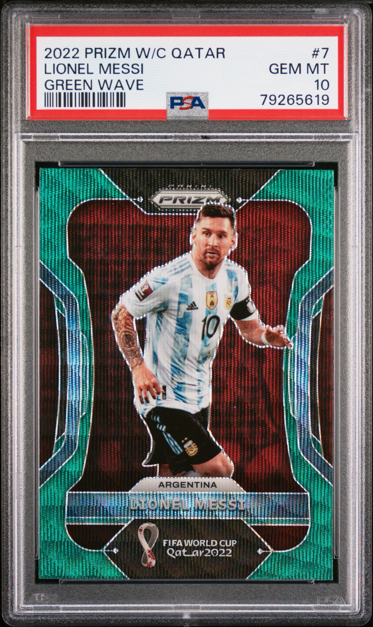 2022 PANINI PRIZM WORLD CUP QATAR #7 LIONEL MESSI GREEN WAVE PSA 10