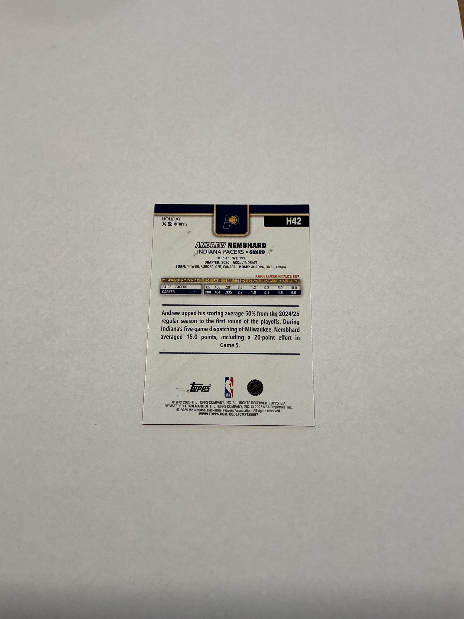 Topps Andrew Nembhard H42 2025/26 Holiday edition. Like new condition.