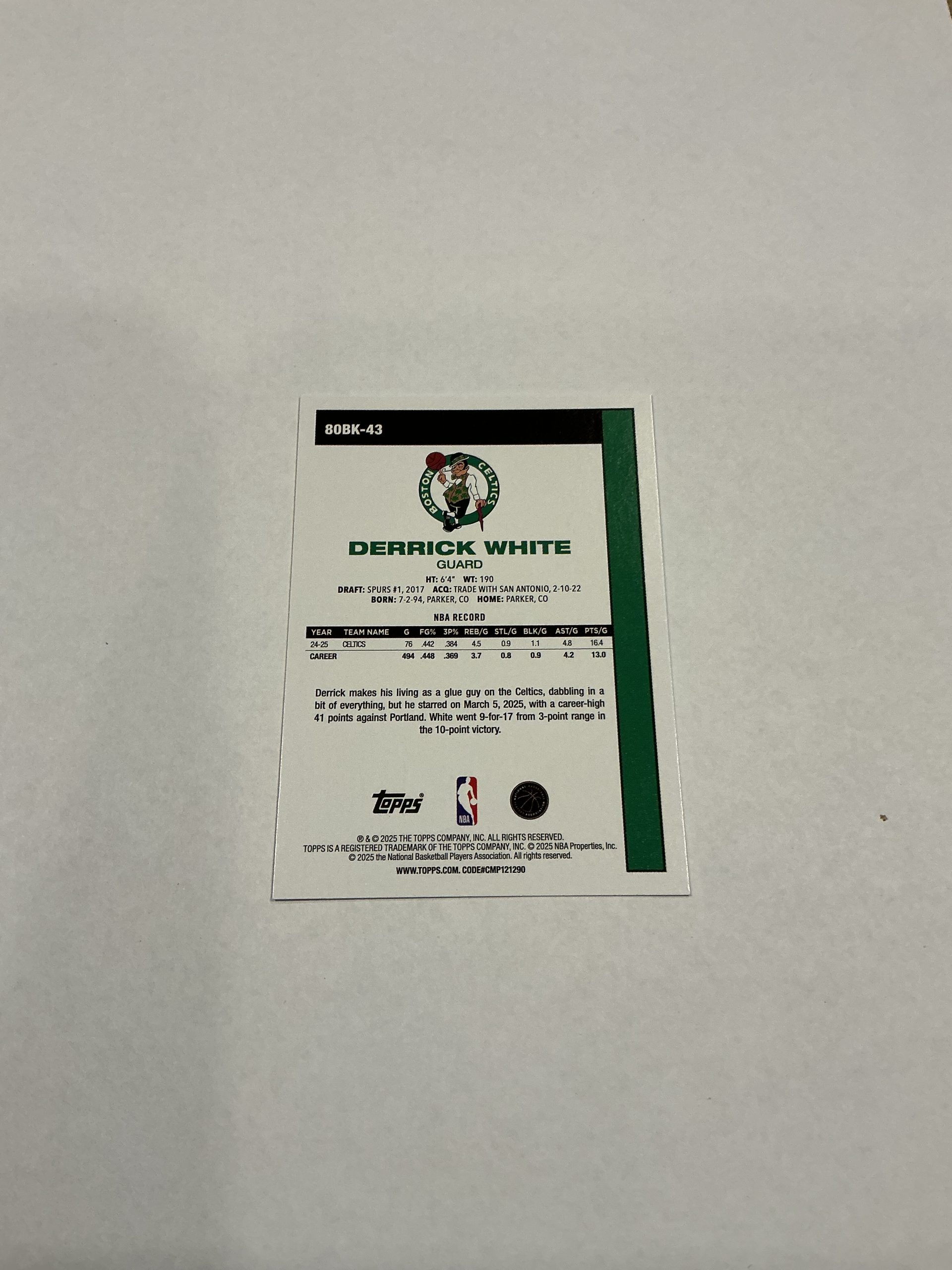 Topps Derrick White 45 Anniversary 80BK-43. Great condition and will ship in a protective sleeve.
