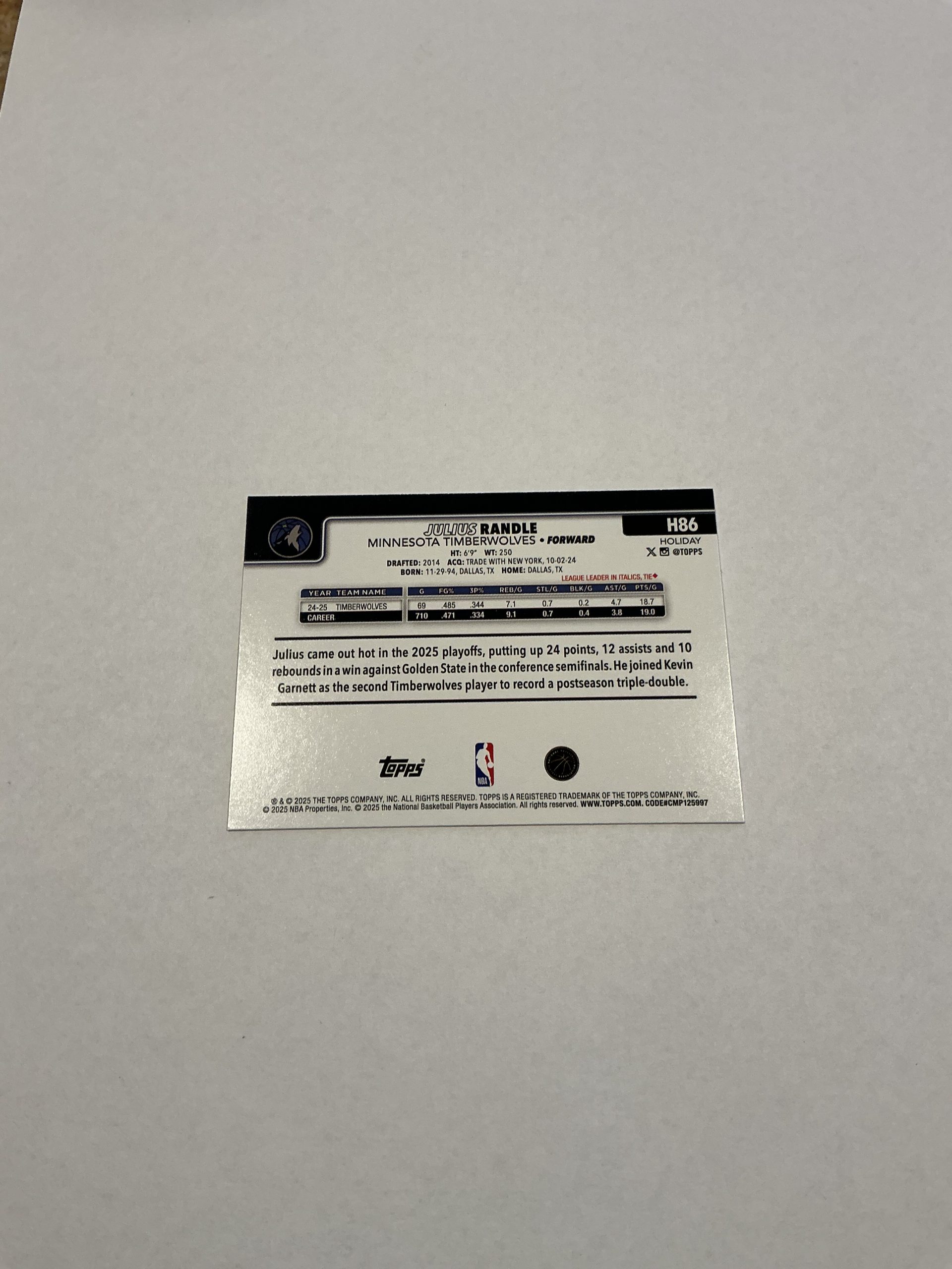 Topps Julius Randle H86 2025/26 Holiday edition. Like new condition.