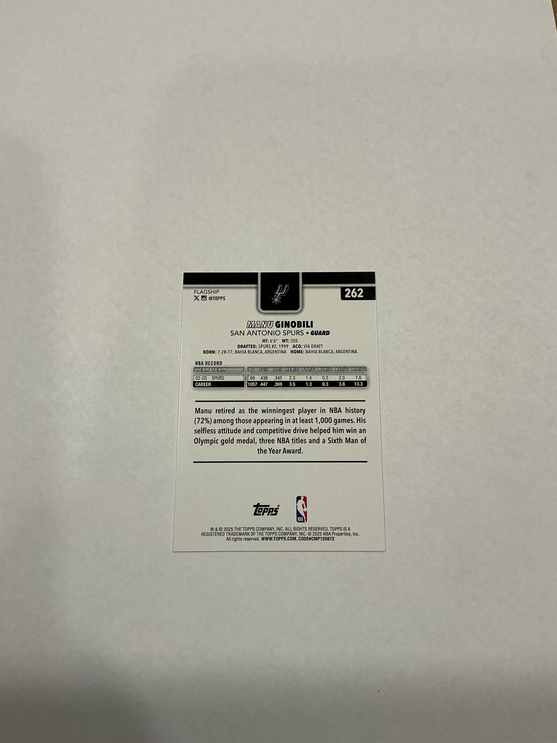 Topps Manu Ginobili #262. In great condition and will ship in a protective sleeve.