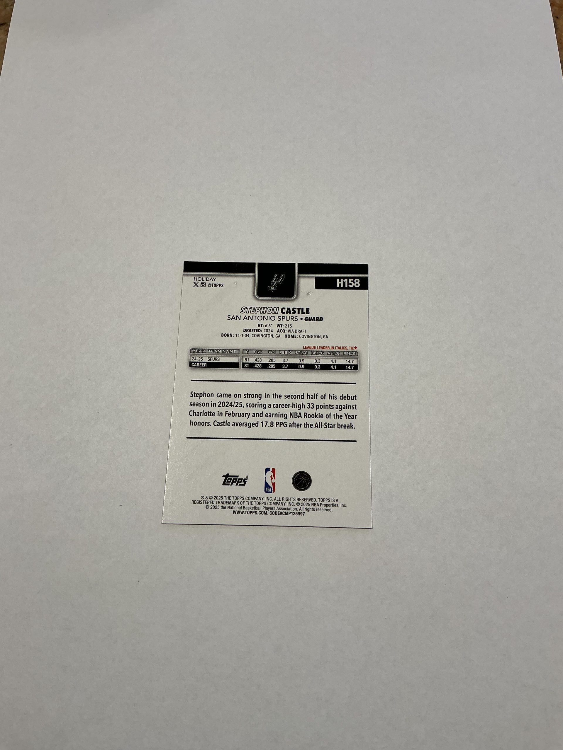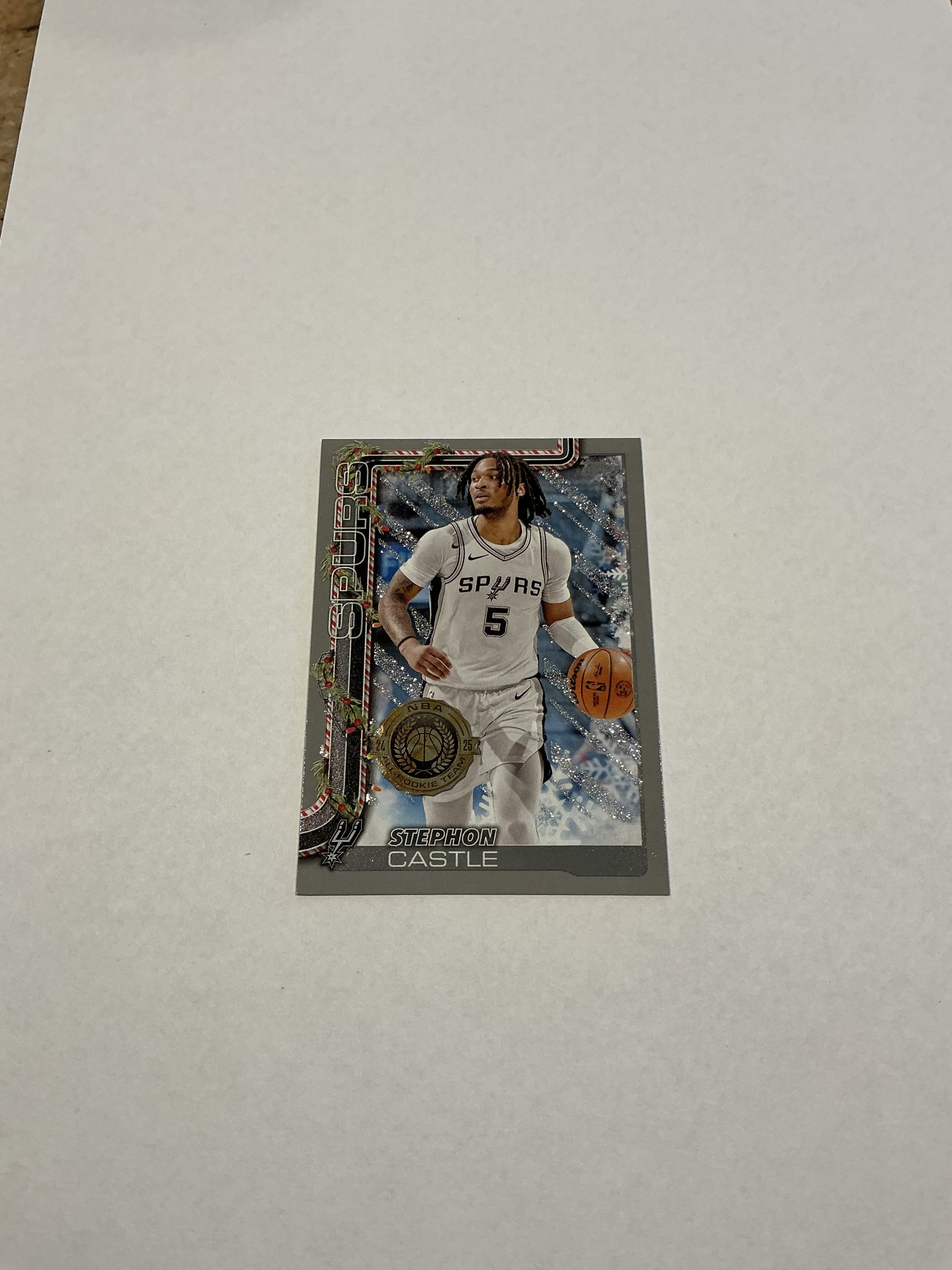 Topps Stephon Castle All Rookie Team H158 2025/26 Holiday edition. Like new condition and will ship in a sleeve.